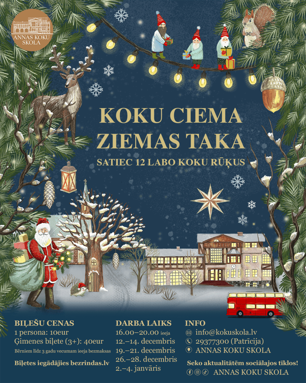 Šajā ziemā sirsnīgi aicinām doties “Koku ciema ziemas takā” - maģiskā pastaigā, kur meža smarža, gaismiņu spēles un rūķu čalas savijas ziemas piedzīvojumā. Ceļā sastapsiet divpadsmit labos rūķus - Latvijas biežāk sastopamo koku tēlus. Katra pietura ļaus iepazīt koku raksturu, īpašības un uzzināt, kā tiem klājas klusajā ziemas mierā.