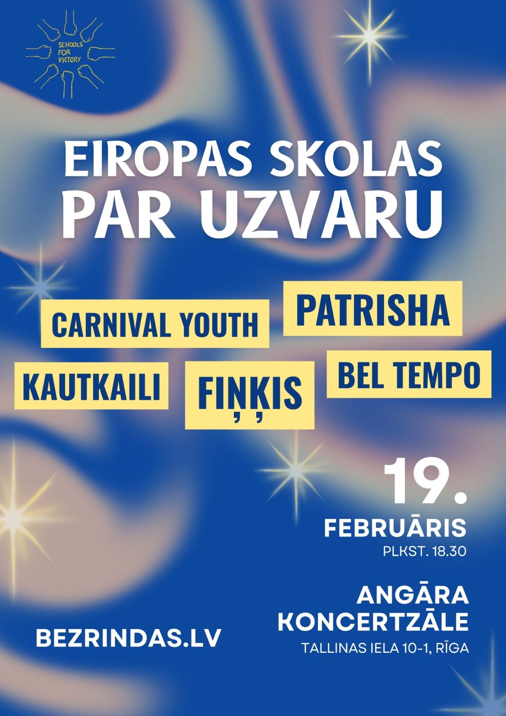 19. februārī Rīgā, Angāra koncertzālē, Tallinas ielā 10-1, no plkst. 18.30 notiks biedrības "Tavi draugi" iniciatīvas "Skolas par uzvaru" labdarības koncerts Ukrainas atbalstam. Tajā uzstāsies Carnival Youth, Fiņķis, Patriša, Kautkaili un Bel Tempo.