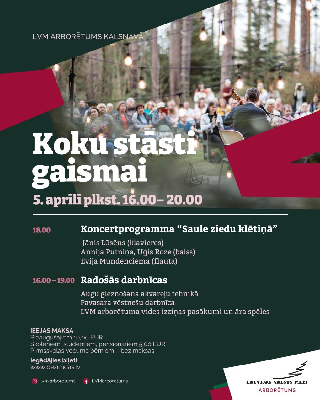 5. aprīlī LVM arborētumā jau ceturto gadu notiks tematiskais pasākums “Koku stāsti gaismai”, kura centrā būs komponistu Imanta Kalniņa un Jāņa Lūsēna koncertprogramma “Saule ziedu klētiņā”.