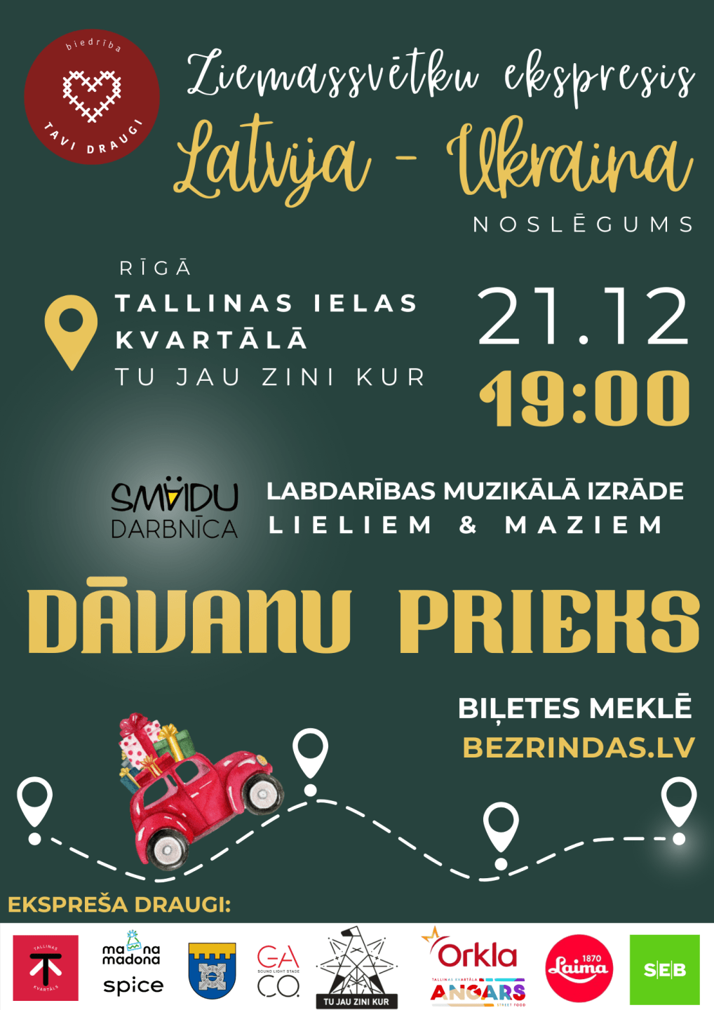 21.12., plkst. 19.00 biedrība TAVI DRAUGI un SMAIDU DARBNĪCA ielūdz nosvinēt LABADRĪBAS BRAUCIENA ZIEMASSVĒTKU EKSPRESIS LATVIJA - UKRAINA noslēgumu! Muzikālā izrāde ''DĀVANU PRIEKS'' Tallinas ielas kvartālā ''Tu jau zini kur'' telpās.