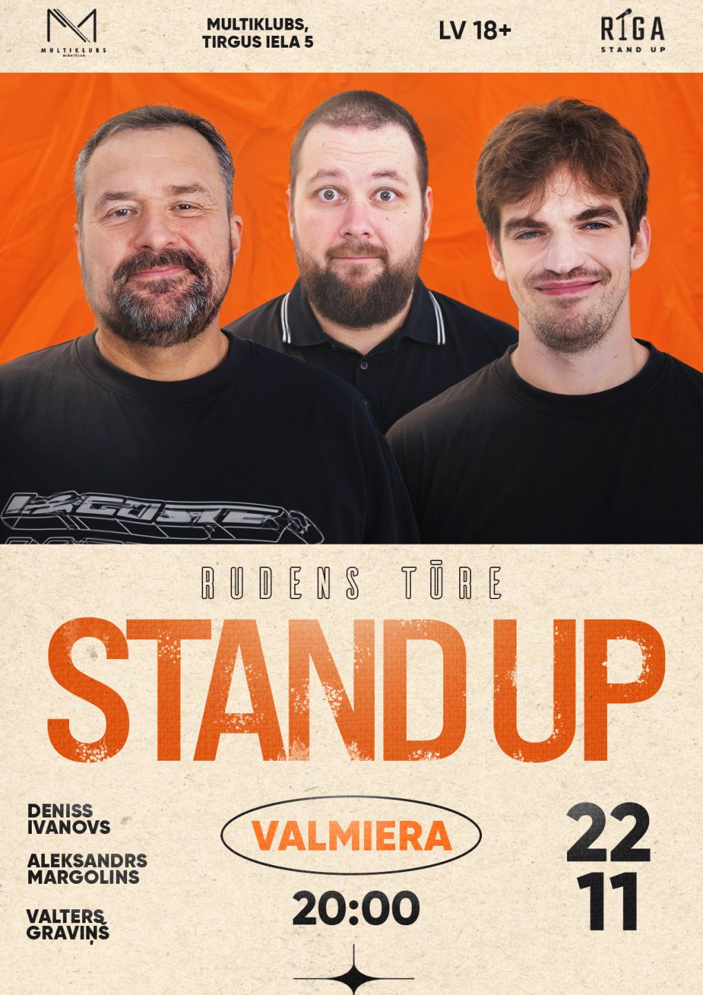Uzstāsies spilgtākie komiķi no Rīgas Stand Up kluba: Aleksandrs Margolins, Deniss Ivanovs un Valters Graviņš.