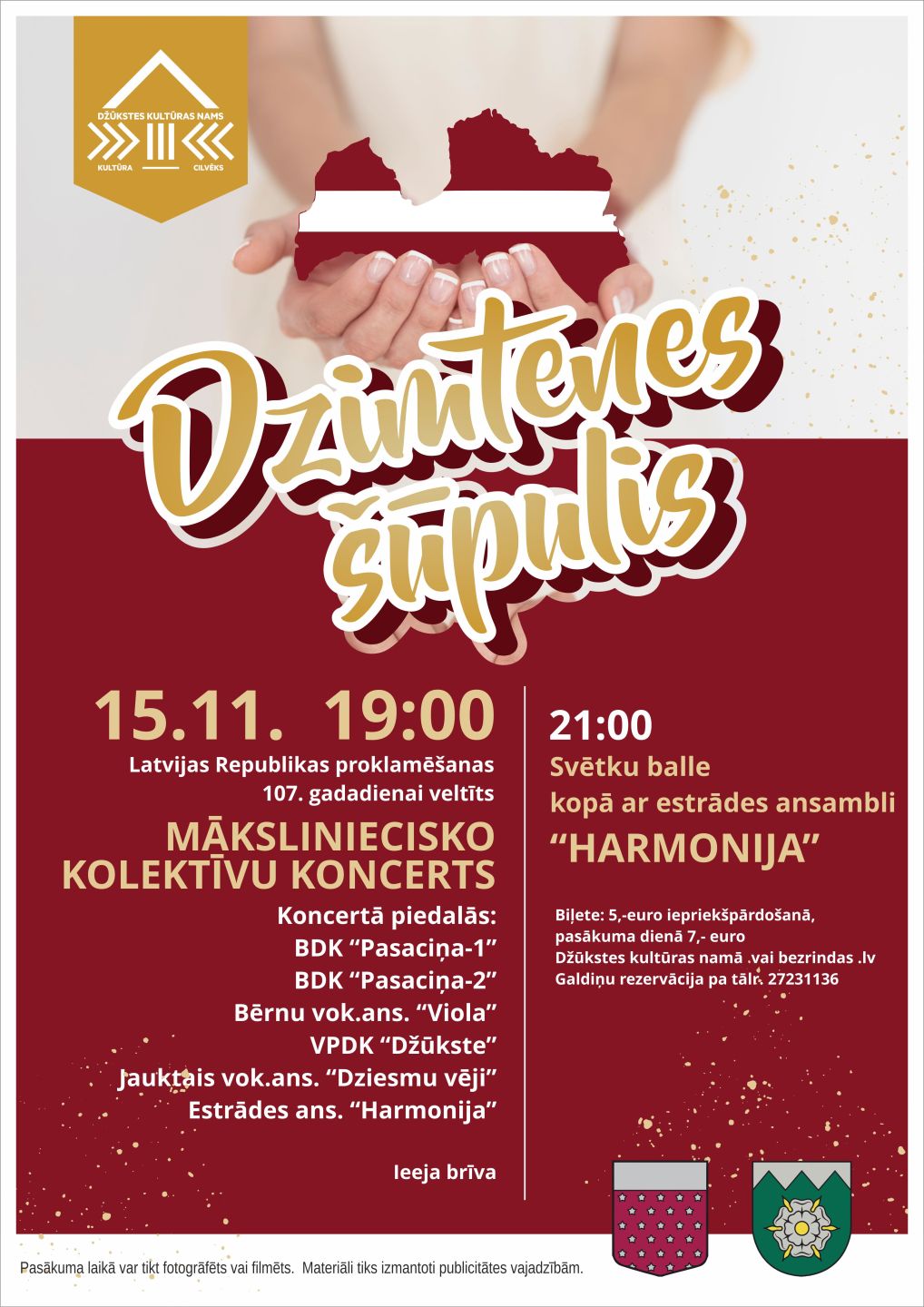 Džūkstes kultūras namā 15. novembrī plkst. 21:00 svētku balle ar estrādes ansambli "Džūkstes Harmonija". Biļetes iepriekšpārdošana bezrindas.lv vai Džūkstes kultūras namā 5,-eur, pasākuma dienā 7-eur. Balle ar groziņiem, galdiņu rezervācija pa tālr. 27231136.